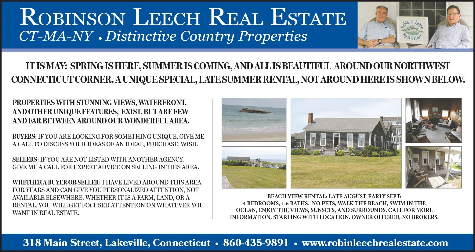 Robinson Leech Real Estate is a family owned firm located in Lakeville, Connecticut. We have been serving the real estate needs of Connecticut’s Northwest Corner, and adjacent Massachusetts and New York for over 50 years. We pride ourselves in giving our clients an honest, straightforward, no hype approach.
